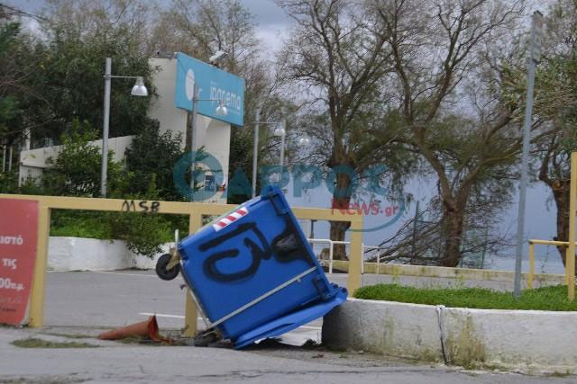 Κάδοι απορριμμάτων παρασύρθηκαν, δέντρα εκριζώθηκαν και αντικείμενα… πέταξαν σε απόσταση δεκάδων μέτρων στην Καλαμάτα, όπου θυελλώδεις άνεμοι έπνεαν όλη τη νύχτα τόσο στο κέντρο όσο και στα περίχωρα της πόλης.