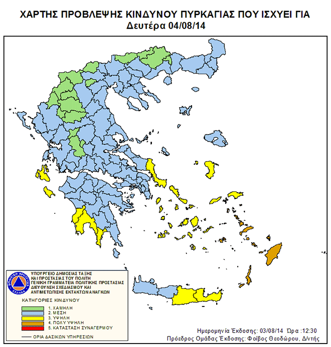 Πολύ υψηλός κίνδυνος πυρκαγιάς (κατηγορία κινδύνου 4) για ολόκληρη την Περιφέρεια Νοτίου Αιγαίου (Δωδεκάνησα) προβλέπεται για σήμερα, Δευτέρα, σύμφωνα με το Χάρτη Πρόβλεψης Κινδύνου Πυρκαγιάς.