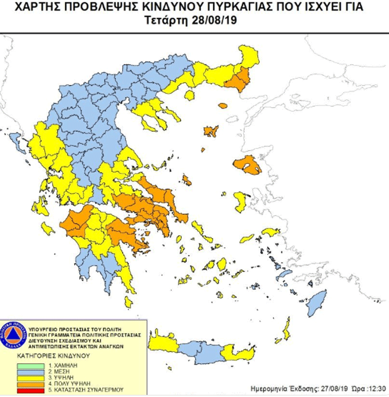 Για ακόμη μία ημέρα, σήμερα (Τετάρτη 28 Αυγούστου) παραμένει πολύ υψηλός ο κίνδυνος πυρκαγιάς σε έξι περιφέρειες της Ελλάδας, σύμφωνα με τον χάρτη πρόβλεψης που εκδίδει η Γενική Γραμματεία Πολιτικής Προστασίας.