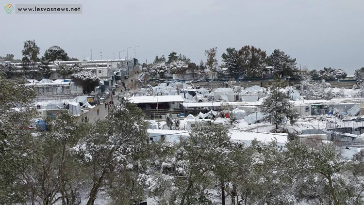 Κυριολεκτικά θαμμένες στο χιόνι ήταν το πρωί οι καλοκαιρινές σκηνές στις οποίες ζουν πολλές εκατοντάδες μετανάστες στον καταυλισμό της Μόριας. Οι τέντες της Ύπατης Αρμοστείας του ΟΗΕ για τους πρόσφυγες που απλώθηκαν πάνω από τις σκηνές προφύλαξαν όσο γινόταν από τη χιονόπτωση, αλλά δεν μπορούσαν να ζεστάνουν τους ανθρώπους, που απεγνωσμένα προσπαθούσαν να βρουν τρόπο να ζεσταθούν.