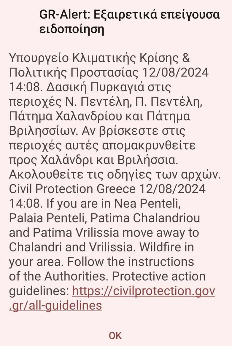 Νέα εντολή εκκένωσης δόθηκε το μεσημέρι της Δευτέρας, 12 Αυγούστου, λόγω της πυρκαγιάς που μαίνεται στην Αττική. Αυτή τη φορά το μήνυμα του 112 αφορά τη Νέα και την Παλαιά Πεντέλη, το Πάτημα Χαλανδρίου και το Πάτημα Βριλησσίων, γεγονός που σημαίνει πως ο αστικός ιστός βρίσκεται σε άμεσο κίνδυνο.