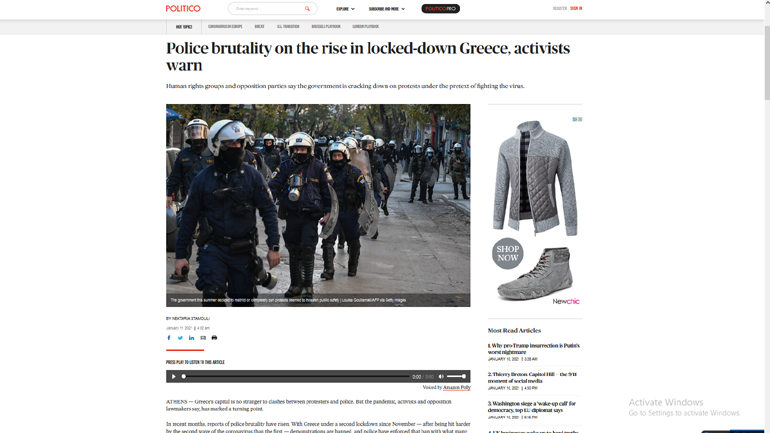 Περιπτώσεις αστυνομικής βίας στην Ελλάδα, καταγράφει σε ανταπόκρισή του από την Αθήνα το περιοδικό Politico, σημειώνοντας ότι όπως καταγγέλλουν οργανώσεις και η αντιπολίτευση, «με το πρόσχημα της καταπολέμησης της πανδημίας, η συντηρητική κυβέρνηση του πρωθυπουργού Κυριάκου Μητσοτάκη καταργεί τις διαμαρτυρίες».