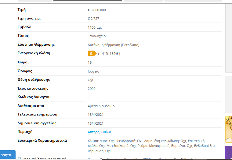 Σε άλλη ιστοσελίδα με πωλήσεις ακινήτων αναφέρεται η μονάδα ως ξενοδοχείο, ενώ η ανάρτηση της αγγελίας έγινε στις 15 Απριλίου καθώς ήταν σε εξέλιξη οι έρευνες.