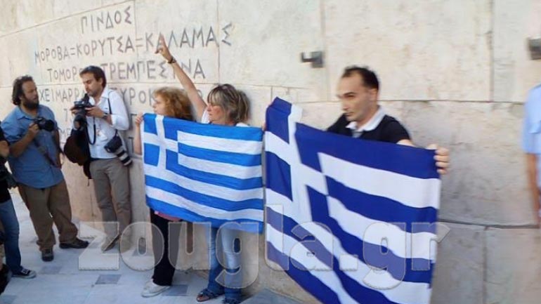 Αγανακτισμένη πολίτης έκαψε το απόγευμα της Δευτέρας τη σημαία του ΣΥΡΙΖΑ, κατά τη διάρκεια της συγκέντρωσης ΑΝΤΑΡΣΥΑ, ΑΔΕΔΥ και μελών της....