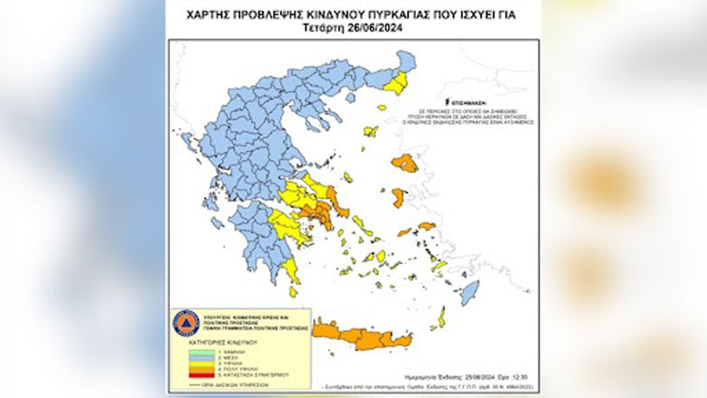 Σύμφωνα με το Χάρτη Πρόβλεψης Κινδύνου Πυρκαγιάς που εκδίδει η Γενική Γραμματεία Πολιτικής Προστασίας του υπουργείου Κλιματικής Κρίσης και Πολιτικής Προστασίας για αύριο Τετάρτη 26 Ιουνίου 2024, προβλέπεται πολύ υψηλός κίνδυνος πυρκαγιάς (κατηγορία κινδύνου 4) για τις εξής περιοχές: