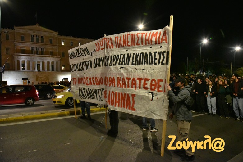 Πορεία από τα Προπύλαια προς το Σύνταγμα πραγματοποίησαν το απόγευμα της Δευτέρας, 12 Φεβρουαρίου, ομάδες φοιτητών, μαθητών, εργαζομένων και διαφόρων συλλογικοτήτων που τάσσονται κατά των ιδιωτικοποιήσεων, αλλά και των ιδιωτικών πανεπιστημίων.