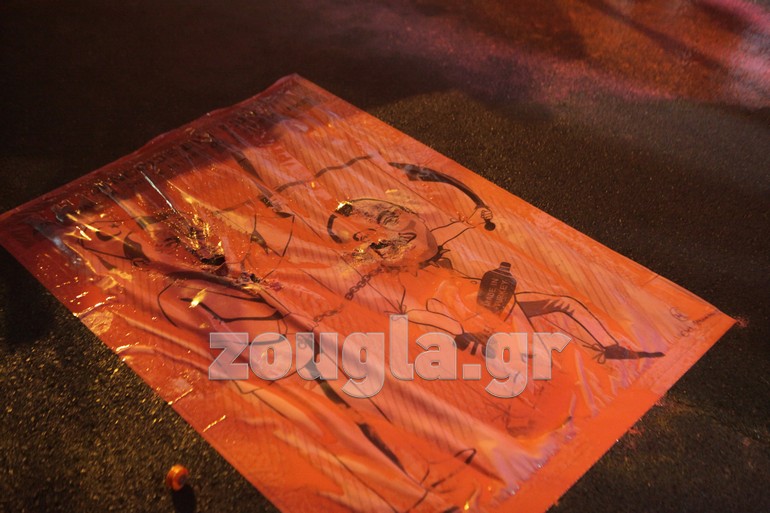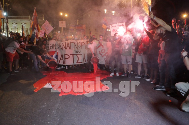 Λίγο πριν τις 8, μερικοί από τους συγκεντρωμένους έκαναν χρήση καπνογόνων και έριξαν μπογιές σε σκίτσο του προέδρου της Τουρκίας, Ταγίπ Ερντογάν, ως ένδειξη διαμαρτυρίας σχετικά με τη στάση που ακολουθεί η χώρα όσον αφορά τη διένεξη στο Ναγκόρνο Καραμπάχ, όπως μπορείτε να δείτε στις παρακάτω φωτογραφίες: