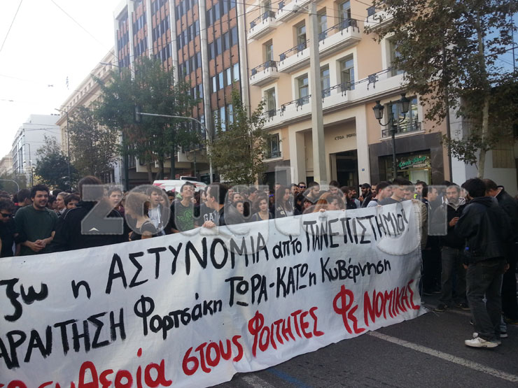 Κρατώντας πανό και φωνάζοντας συνθήματα κατά του υπουργείου Παιδείας, οι φοιτητές ξεκίνησαν την πορεία τους από τη Νομική, ωστόσο δεν μπόρεσαν να περάσουν από τη Ρήγα Φεραίου, καθώς δυνάμεις των ΜΑΤ είχαν παραταχθεί κάθετα του δρόμου. Αφού παρέμειναν εκεί για 10 λεπτά, συνέχισαν στην Ιπποκράτους και μέσω της Πεσματζόγλου, βγήκαν στη Σταδίου, την οποία και άρχισαν να ανεβαίνουν μέχρι την πλατεία Κοραή. Η πορεία ολοκληρώθηκε μπροστά στα Προπύλαια.