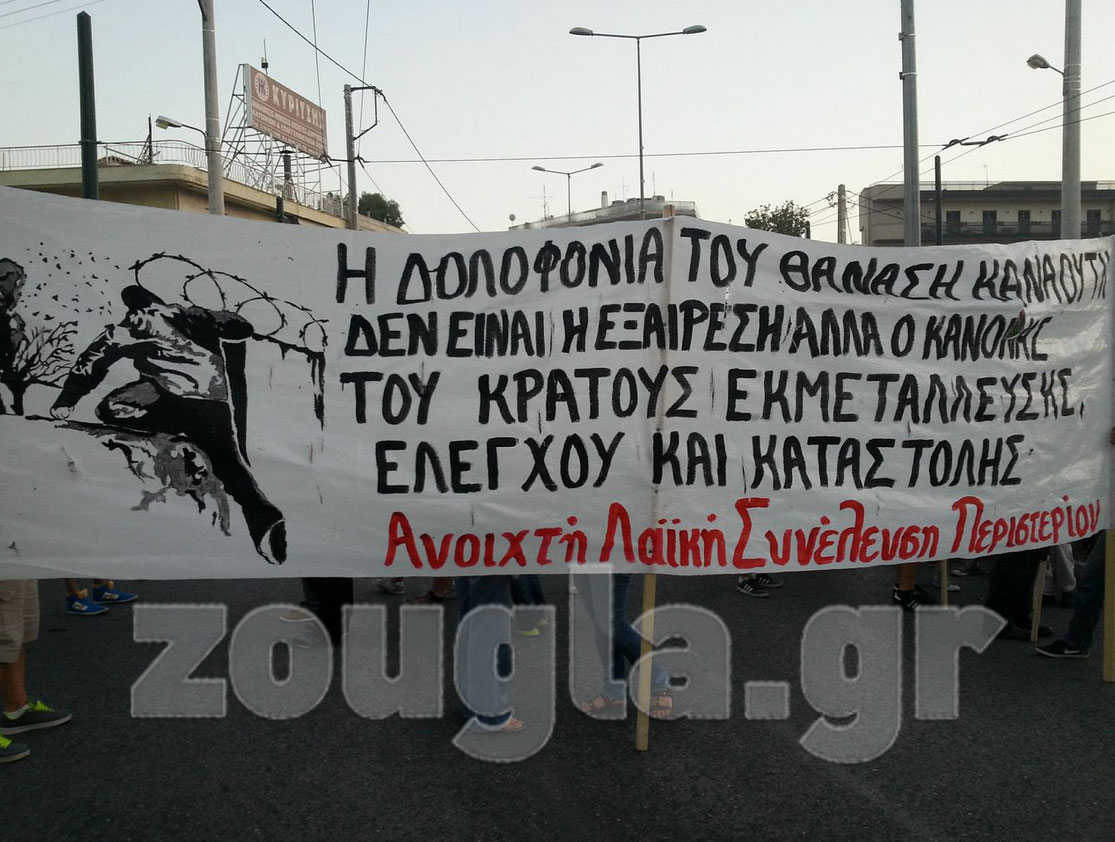 Πορεία διαμαρτυρίας για τον θάνατο του 19χρονου Θανάση Καναούτη, ο οποίος έχασε τη ζωή του πέφτοντας από τρόλεϊ μετά από έντονο διαπληκτισμό που είχε με ελεγκτή εισιτηρίων, πραγματοποιήθηκε το απόγευμα της Παρασκευής στην πλατεία Περιστερίου. Την κινητοποίηση διοργάνωσε η «Συνέλευση Περιστερίου Ενάντια στις Κρατικές Δολοφονίες και την Καταστολή».