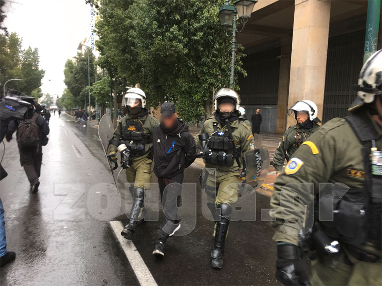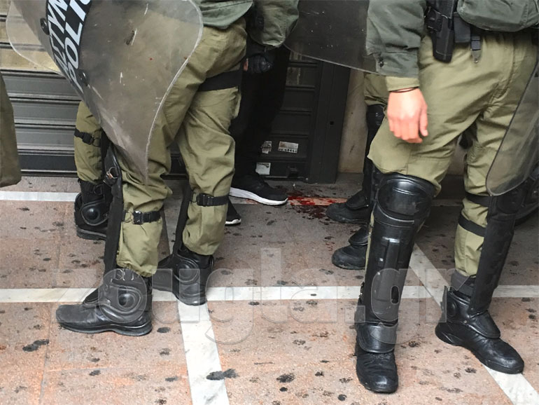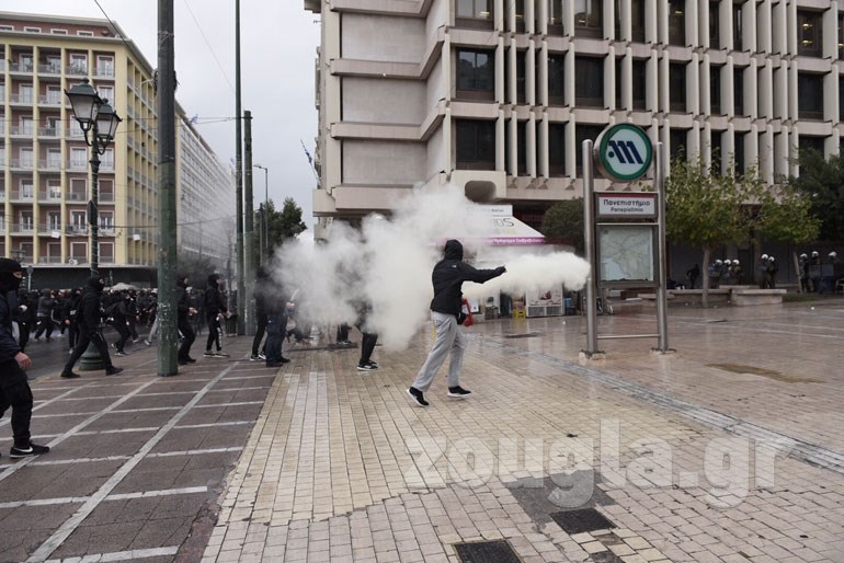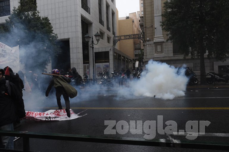 Λίγο μετά τις 13.00 το μεσημέρι επικράτησε ένταση μεταξύ διαδηλωτών και ΜΑΤ και έπεσαν τα πρώτα δακρυγόνα έξω από το Υπουργείο Εσωτερικών στη Σταδίου, ενώ έγιναν και 10 προσαγωγές. Όπως καταγγέλλουν διαδηλωτές, δέχθηκαν αναίτια επίθεση από αστυνομικούς, με αποτέλεσμα κάποιοι να τραυματιστούν και να γεμίσουν αίματα.