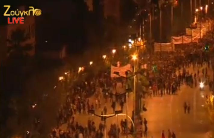 Στις 17.05 ξεκίνησε πορεία φοιτητών, από την αρχή της Β. Σοφίας, 100 περίπου μέτρα μακριά από την πλαϊνή είσοδο του Κοινοβουλίου. Η πορεία κατευθύνεται προς την αμερικανική πρεσβεία. Eπίσης, από το ύψος του Πολεμικού Μουσείου ξεκίνησε την πορεία του το μπλοκ συνταξιούχων. Στο πλαίσιο της διαδήλωσης, ένας εκ των συνταξιούχων κρατούσε συμβολικά μία καμμένη αμερικανική σημαία.