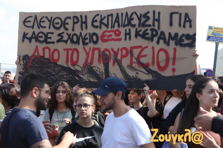 Πορεία διαμαρτυρίας πραγματοποιούν μαθητές απ’ όλη την Αθήνα με τη συνοδεία και υποστήριξη των γονιών και των εκπαιδευτικών τους έξω από το υπουργείο Παιδείας.