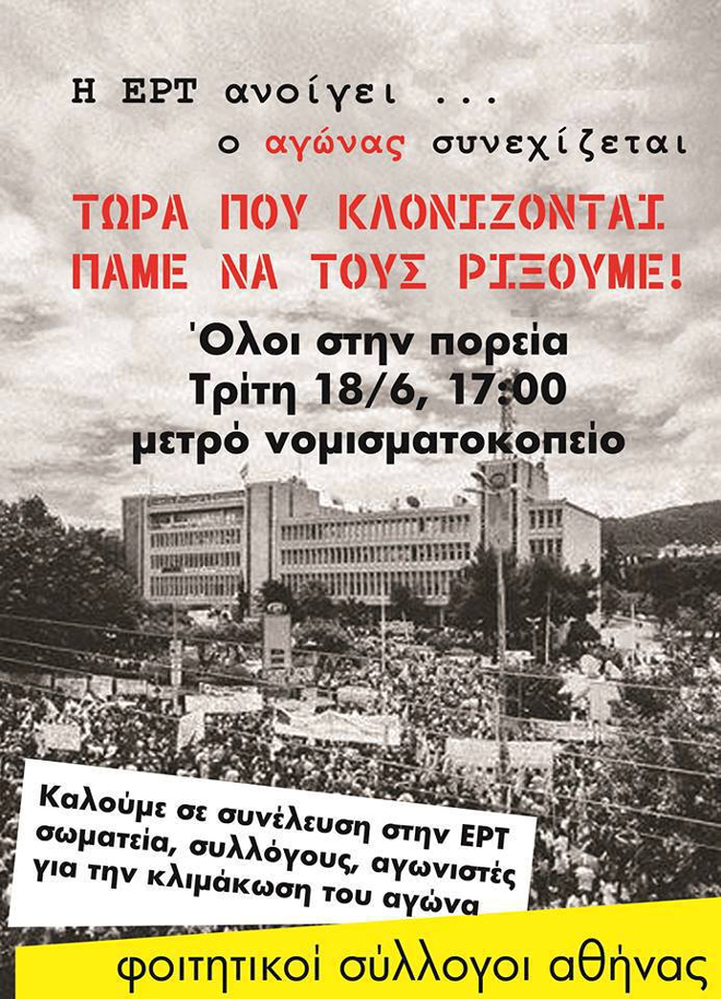 Οι φοιτητικοί σύλλογοι Φιλοσοφικής, Βιολογικού, Φαρμακευτικής, Οδοντιατρικής, Επικοινωνίας και ΜΜΕ του Ε.Κ.Π.Α., ΣΓΤΚΣ ΤΕΙ Αθήνας, Ηλεκτρολόγων, Μηχανολόγων, Τοπογράφων, Μεταλλειολόγων και Χημικών Μηχ/κών του ΕΜΠ καλούνε την Τρίτη 18/6 στις 5μ.μ. όλη τη σπουδάζουσα νεολαία σε πορεία από το Νομισματοκοπείο προς την ΕΡΤ. Η νεολαία στο πλευρό των εργαζομένων, να πλημμυρίσει το ραδιομέγαρο!