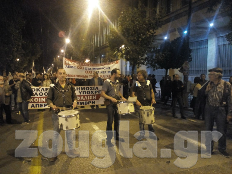 Φωνάζοντας συνθήματα εναντίον της κυβερνητικής πολιτικής και κρατώντας πανό, οι συγκεντρωμένοι απαίτησαν την απαγκίστρωση της χώρας από το καθεστώς των μνημονίων.
