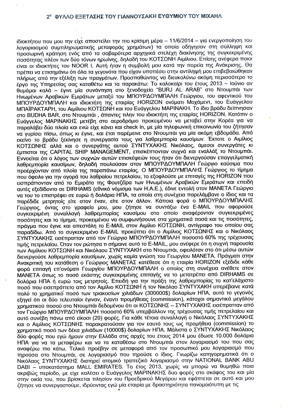 Ακολουθεί η κατάθεση του Μάκη Γιαννουσάκη: «Σας κάλεσα στο χώρο που κρατούμαι με σκοπό να δείξω την πραγματική μου μεταμέλεια και την πρόθεση μου να συνεχίσω να βοηθάω περαιτέρω την εξέλιξη των ερευνών που αφορούν στην υπόθεση μεταφοράς πλέον των δυο τόνων ηρωίνης με το πλοίο Noor One. Στα πλαίσια αυτά και προκειμένου να βοηθήσω σημαντικά την έρευνα σας ως προς την περαιτέρω διερεύνηση της υπόθεσης αυτής, σας προσκομίζω το αντίγραφο του εταιρικού μου λογαριασμού (G-TANKERS) που διατηρούσα στα Ηνωμένα Αραβικά Εμιράτα την εποχή εκείνη- δηλαδή τα έτη 2013 και 2014. Σημειώνω ότι κάποιες από τις μεταφορές που φαίνονται στο έγγραφο που σας προσκομίζω εμφανίζουν ως αποστολέα την εταιρία FT MARITIME και αφορούν τον καταδικασμένο για την υπόθεση Φ.Π και τον Τ.Τ, συνεταίρο του. Οι μεταφορές που εμφανίζουν ως αποστολέα την εταιρία FAIRBANKS αφορούν τον ήδη καταδικασμένο για την υπόθεση Κ.Β και τον εργοδότη του Κ.Κ. Επιπρόσθετα σας αναφέρω ότι οι μεταφορές που προαναφέρθηκαν και φαίνονται στο έγγραφο που σας προσκομίζω δεν αφορούν σε εμπορική συναλλαγή οιουδήποτε είδους μεταξύ της εταιρίας μου και των εταιριών αυτών».