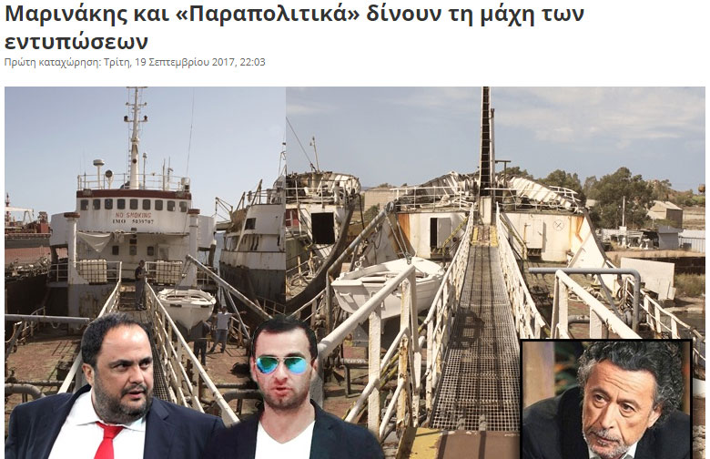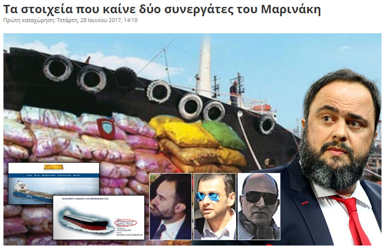Ο υιός τώρα φέρεται να εμπλέκεται σε μία εταιρεία με το όνομα Marathon Carriers, με έδρα τον Πειραιά και γραφεία -πού αλλού;- επί της οδού Κολοκοτρώνη 130 και μάλιστα στον 2ο όροφο. Οποία σύμπτωσις. Εκεί όπου στεγάζεται και το δικηγορικό του γραφείο. Η εταιρεία αυτή είναι καταγεγραμμένη στα μητρώα του Υπουργείου Ναυτιλίας και έχει ως έδρα τα νησιά Μάρσαλ.