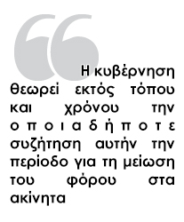 Σύμφωνα με πληροφορίες, η κυβέρνηση θεωρεί εκτός τόπου και χρόνου την οποιαδήποτε συζήτηση αυτήν την περίοδο για τη μείωση του φόρου στα ακίνητα, από τη στιγμή μάλιστα που δεν έχει ολοκληρωθεί η διαδικασία των διορθώσεων στα λάθη τα οποία εντοπίστηκαν στο Ε9. Ακόμη ένας ανασταλτικός παράγοντας για την οποιαδήποτε αλλαγή θεωρείται το… θολό τοπίο αναφορικά με το τελικό ύψος των εσόδων που θα μπουν στα κρατικά ταμεία, καθώς μέχρι στιγμής δεν έχει υπολογιστεί η σχετική μείωση η οποία θα προκύψει από τις απαλλαγές και τις φορο-ελαφρύνσεις που αναμένεται να εφαρμοστούν.