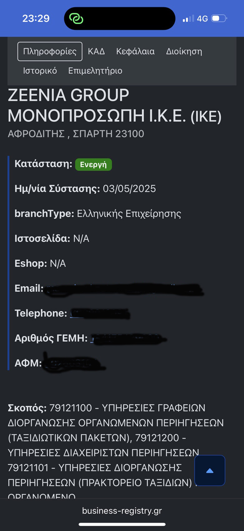 Η Μαρεβίνα Κουτσοβασίλη, παρόλο που ήταν ήδη σε διένεξη με «πελάτες» της και γνωρίζοντας ότι έχει γίνει γνωστή η δράση της, έφτασε στο σημείο, μερικές ημέρες πριν αποκαλυφθεί δημόσια η απάτη με το ταξίδι στου Άμπου Νταμπι, να συστήσει νέα ταξιδιωτική εταιρία, όπως μπορείτε να δείτε στην εικόνα, όπου και κατέθεσε αίτηση σύστασης στο Γενικό Εμπορικό Μητρώο (Γ.Ε.ΜΗ.) προκειμένου να πάρει άδεια επιχείρησης, την οποία και έλαβε στις 03/05/2025.