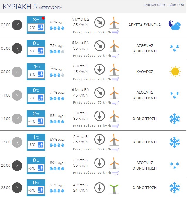 3. Από το απόγευμα χιόνια θα πέσουν στα ορεινά – ημιορεινά κυρίως των κεντρικών και βόρειων Κυκλάδων καθώς και της Κρήτης. Στην Κρήτη οι χιονοπτώσεις θα είναι κατά περιόδους πυκνές.