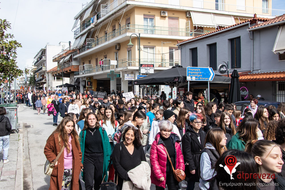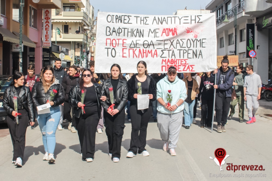 Η συγκέντρωση πραγματοποιήθηκε στα παλαιά ΚΤΕΛ και ακολούθησε πορεία στους κεντρικούς δρόμους της πόλης, με τους μαθητές της Πρέβεζας να είναι στην κορυφή της πορείας με ένα χαρακτηριστικό πανό που έγραφε: “Οι ράγες της ανάπτυξης βάφτηκαν με αίμα, ποτέ δε θα ξεχάσουμε το έγκλημα στα τρένα”.