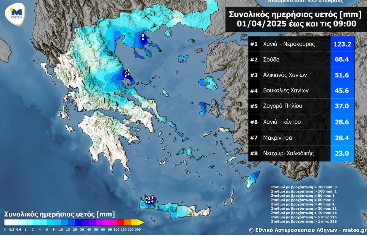 Το μεγαλύτερο ημερήσιο ύψος βροχόπτωσης καταγράφεται στον μετεωρολογικό σταθμό του Εθνικού Αστεροσκοπείου Αθηνών/meteo.gr που βρίσκεται στο Νεροκούρου Χανίων και ανέρχεται σε 123.2 χιλιοστά.