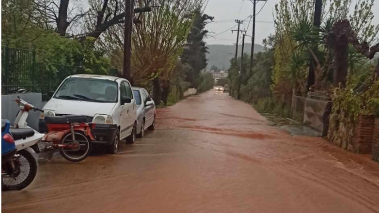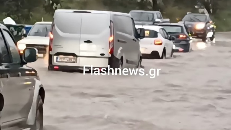 Τα αυτοκίνητα κινούνται με δυσκολία, ενώ σε πολλές περιοχές, το ύψος του νερού τα ξεπερνά και οι δρόμοι μετατρέπονται σε ορμητικούς χειμάρρους.