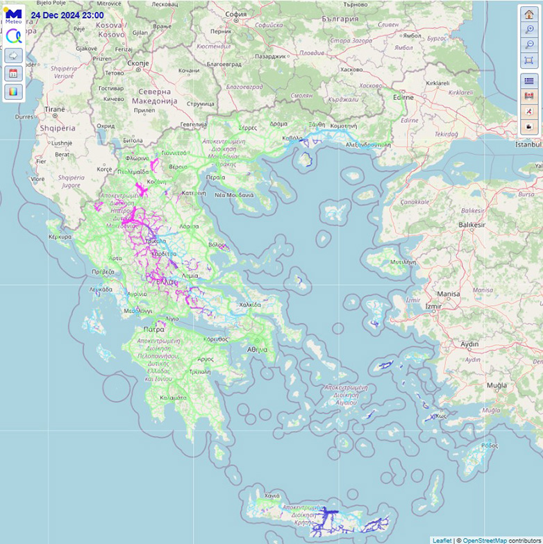 Παράλληλα, το meteo έχει δημιουργήσει έναν διαδραστικό χάρτη, με το όνομα «ROADS» («δρόμοι»), στον οποίο μπορείτε να δείτε τις περιοχές που αναμένονται χιονοπτώσεις, αλλά και έντονες βροχοπτώσεις.