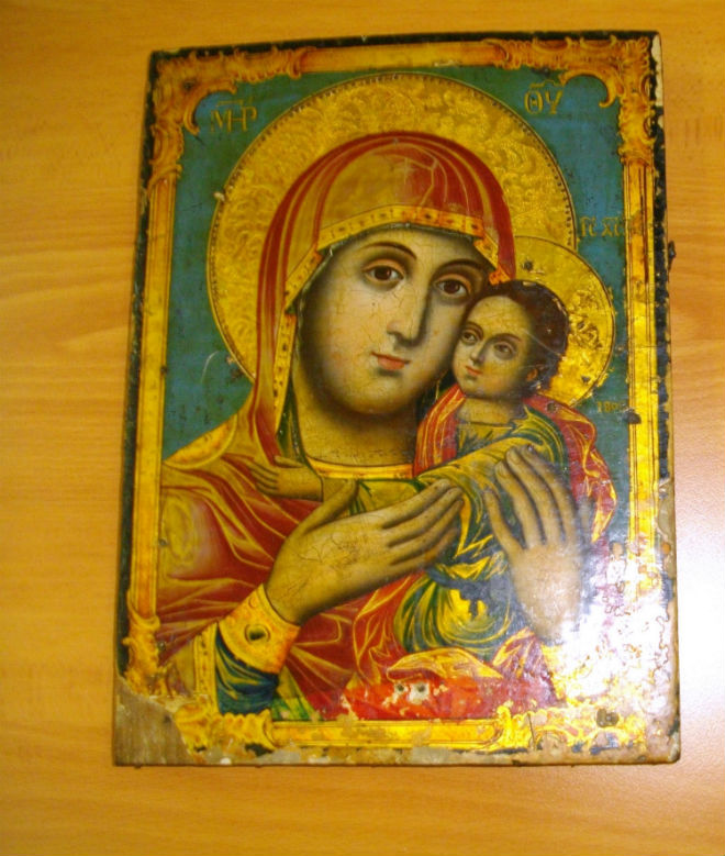 Μία εικόνα απεικονίζουσα την Παναγία Βρεφοκρατούσα, διαστάσεων 0,29 Χ 0,215 μέτρων με επιγραφή 1808.