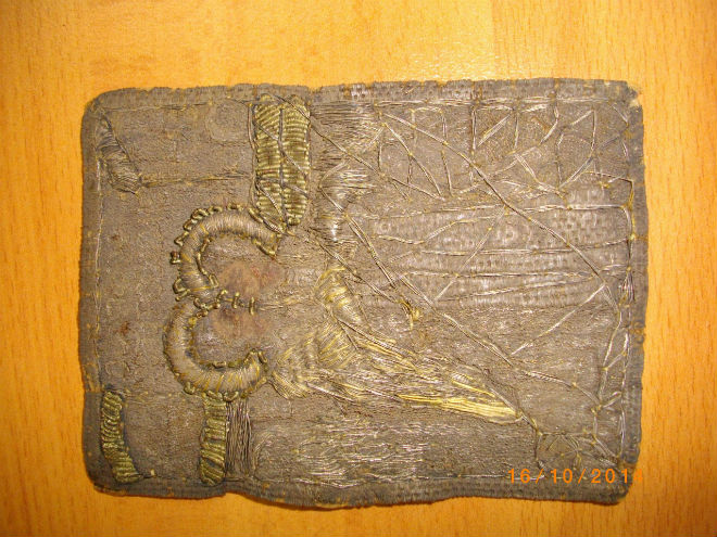 Ένα τεμάχιο αμφίων, ορθογώνιου σχήματος, με δυσδιάκριτη παράσταση «Ο Ασπασμός Μαρίας και Ελισσάβετ», διαστάσεων 7,5 Χ 10 εκατοστών, κατασκευασμένο από δέρμα με ίχνη αργυρής κλωστής.