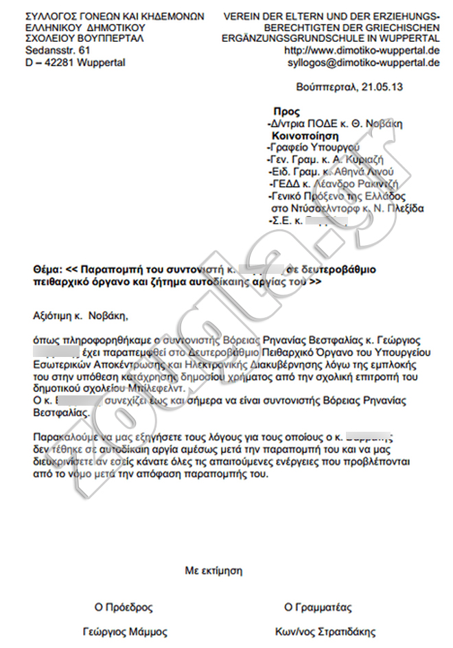 Όπως προκύπτει από το ρεπορτάζ, η «αντιδραστική» εκπαιδευτικός μετέφερε τα όσα διημείφθησαν στο συντονιστικό γραφείο στον πρόεδρο του Συλλόγου Γονέων και Κηδεμόνων του Δημοτικού Σχολείου Βούπερταλ Γιώργο Μάμμο, ο οποίος αμέσως έστειλε επιστολή στον υπουργό Παιδείας, ζητώντας την παρέμβασή του και την άμεση διερεύνηση της υπόθεσης.