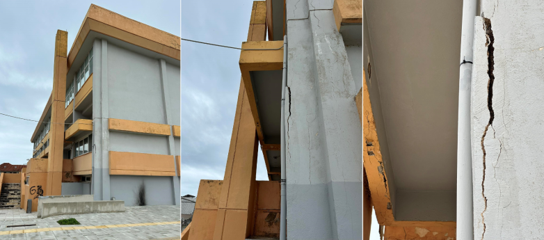 Όπως μπορείτε να δείτε στις φωτογραφίες, είναι εμφανές πως έχουν αποκολληθεί κομμάτια από την εξωτερική θωράκιση του κτηρίου, ενώ σε ορισμένα σημεία είναι πλέον ορατά και τα σίδερα από τις κολόνες.