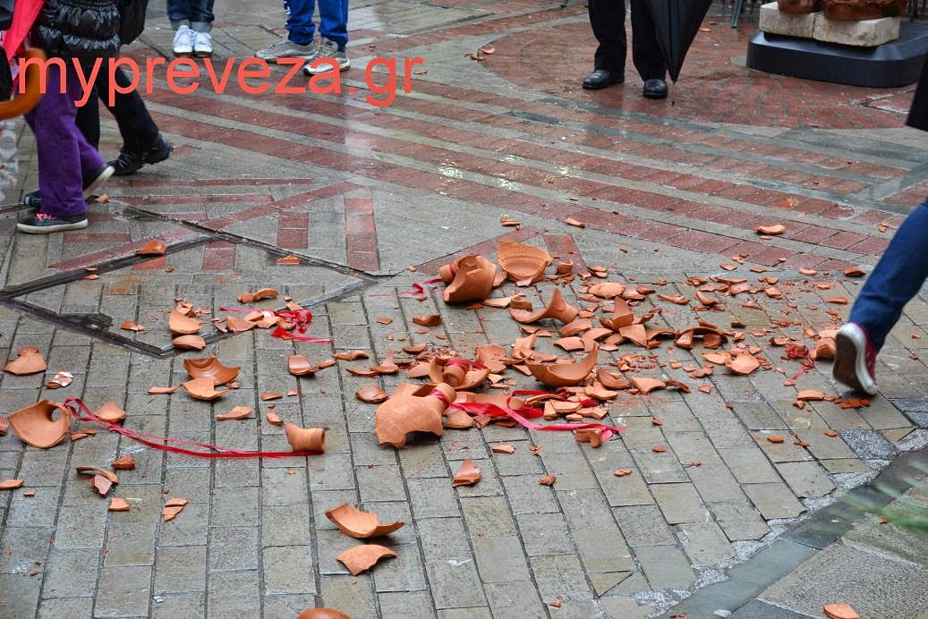 Λίγο μετά τις 9.30 το πρωί η καμπάνα του Αγίου Χαράλαμπου σήμανε την πρώτη Ανάσταση και αμέσως οι Πρεβεζιάνοι -που συγκεντρώθηκαν παρά το ψιλόβροχο- έριξαν δεκάδες πήλινα αντικείμενα και τα έσπασαν στον πλακόστρωτο. Κροτίδες έπεφταν συνεχώς σε όλο το ιστορικό κέντρο, στέλνοντας το μήνυμα της νίκης της ζωής ενάντια στον θάνατο.