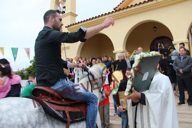 Δύο Καβαλάρηδες με τα άλογά του μετά τον εσπερινό της Αγάπης και του Αγίου Γεωργίου παρέλαβαν την εικόνα του Αϊ Γιώργη από τον Πάτερ Δημήτριο και αφού την περιέφεραν στον οικισμό του Αγίου Θωμά, κατέληξαν στο εκκλησάκι του Αϊ Γιώργη στο Σκαφιδάκι όπου την τοποθέτησαν.