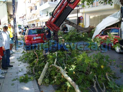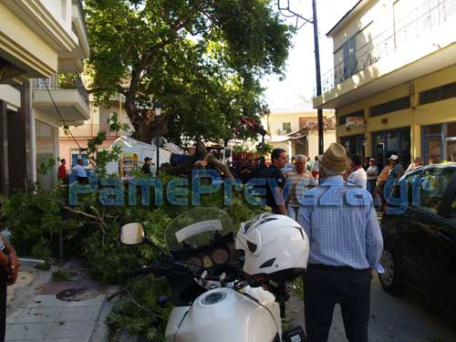 Στις 09.45 σήμερα το πρωί και ενώ στον δρόμο κυκλοφορούσαν όχι μόνο αυτοκίνητα αλλά και πεζοί, ένα μεγάλο κλαδί έσπασε πέφτοντας επάνω σε διερχόμενα οχήματα αλλά και σε άλλα παρκαρισμένα, προξενώντας υλικές ζημιές.
