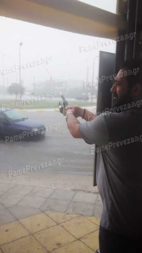 Μάλιστα, ένας επιχειρηματίας, με αρκετή δόση χιούμορ, δεν δίστασε να… πάρει το ψαροκάλαμό του και να αρχίσει να «ψαρεύει» στους δρόμους που είχαν μετατραπεί σε λίμνες.