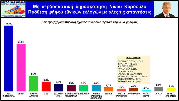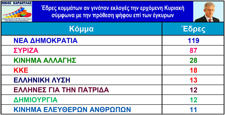 «Η παρούσα είναι η πρώτη έρευνά μου, μετά τις πλήρως επαληθευμένες δημοσκοπήσεις μου για τις ευρωεκλογές και τις εθνικές εκλογές 2019, για την εκλογή Προέδρου της ΝΔ το 2016, καθώς και για τις εθνικές εκλογές 2015», αναφέρει ο κ. Καρδούλας και συνεχίζει: