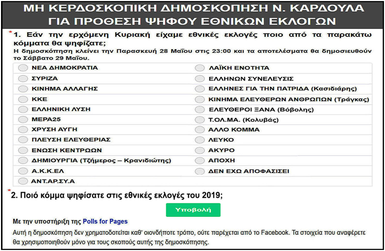 »Η έρευνα είναι μη κερδοσκοπική, τα έξοδά της για την Polls for Pages και το Facebook πληρώθηκαν αποκλειστικά από εμένα, απευθύνθηκε στους χρήστες του Facebook στην Ελλάδα ηλικίας 18 ετών και άνω και το ερωτηματολόγιο της έρευνας φαίνεται παρακάτω»:
