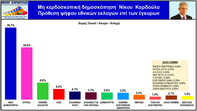 Στο 10% είναι η διαφορά μεταξύ ΝΔ-ΣΥΡΙΖΑ και πιθανότατα να εισέλθουν τρία νέα κόμματα στη Βουλή, σύμφωνα με την έρευνα πρόθεσης ψήφου του Νίκου Καρδούλα*.