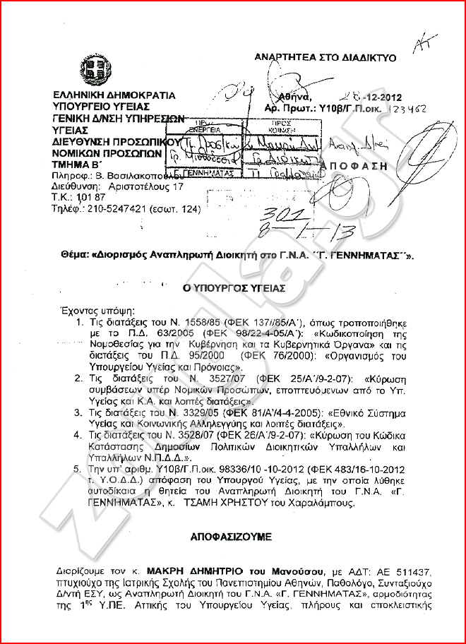 Σύμφωνα με το ρεπορτάζ, στις 28 Δεκεμβρίου του 2012 δημοσιεύτηκε απόφαση του υπουργού Υγείας με την οποία διορίζει ως αναπληρωτή διοικητή του Νοσοκομείου ΓΝΑ «Γ. Γεννηματάς» τον κ. Μακρή Δημήτριο, ο οποίος μέχρι τη συνταξιοδότησή του υπηρετούσε στο συγκεκριμένο ίδρυμα.