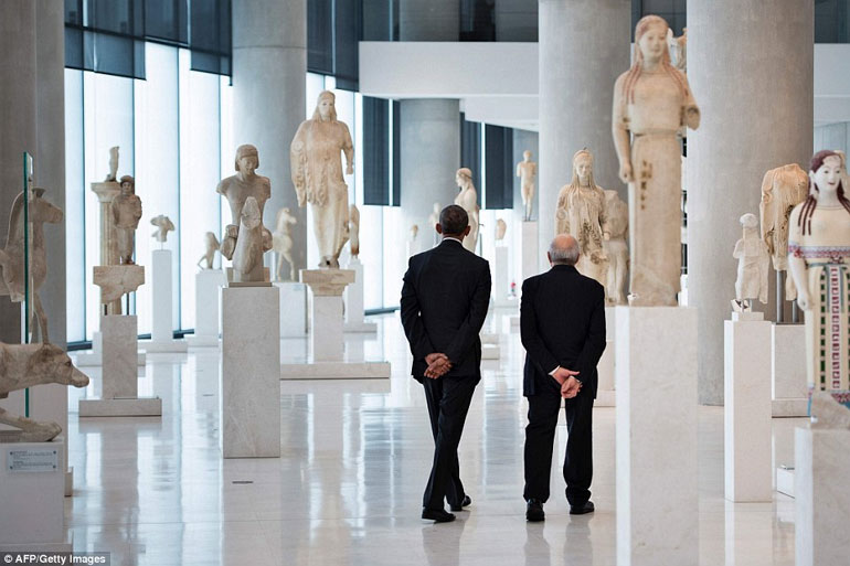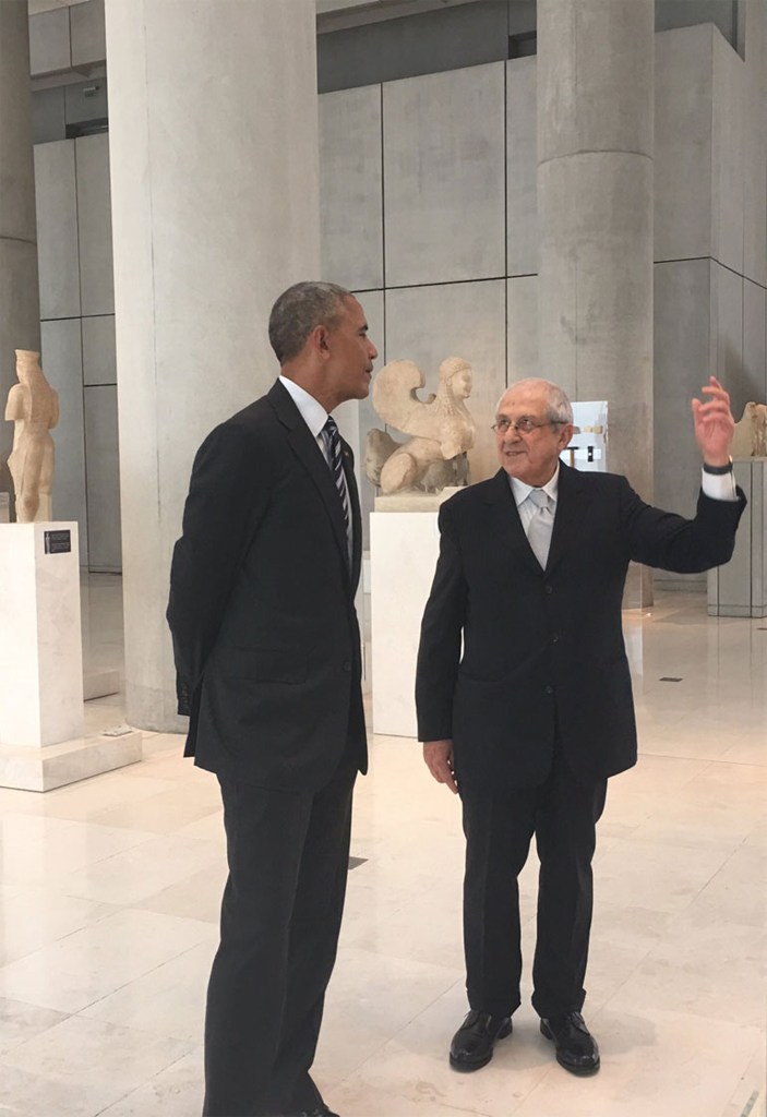 Κάτι λιγότερο από μία ώρα διήρκεσε η ιδιωτική ξενάγηση του απερχόμενου προέδρου των Ηνωμένων Πολιτειών της Αμερικής Μπαράκ Ομπάμα στο Μουσείο της Ακρόπολης από τον καθηγητή και πρόεδρο του Μουσείου κ. Δημήτρη Παντερμαλή.