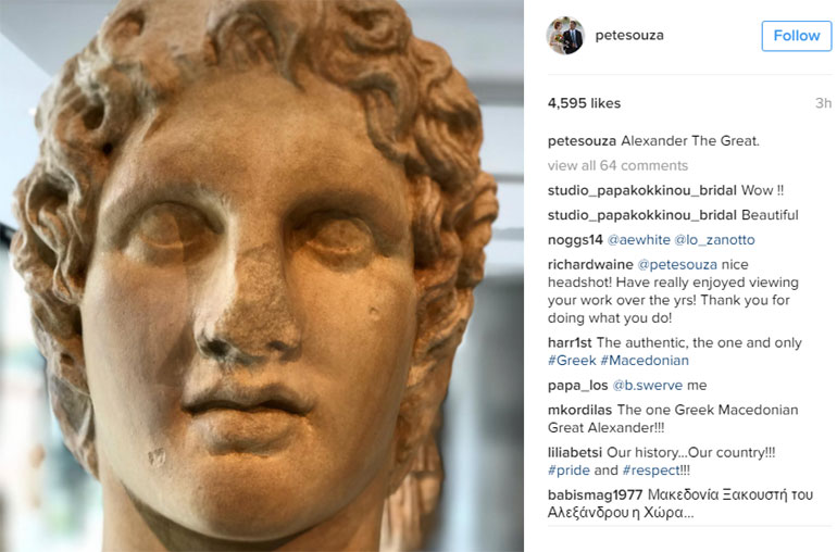 Κατά τη διάρκεια της ξενάγησης, ο προσωπικός φωτογράφος του προέδρου, Πιτ Σόουζα, ανήρτησε στον λογαριασμό του σε μέσο κοινωνικής δικτύωσης μία φωτογραφία με την προτομή του Μεγάλου Αλεξάνδρου.