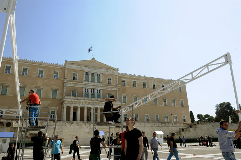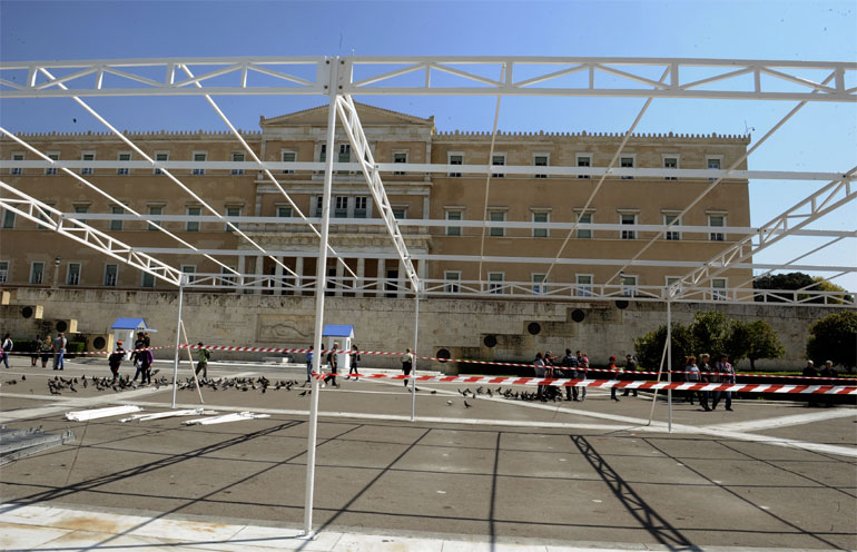 Μπροστά από τη Βουλή στήνεται μια μεγάλη εξέδρα, στην οποία θα βρίσκονται οι επίσημοι.