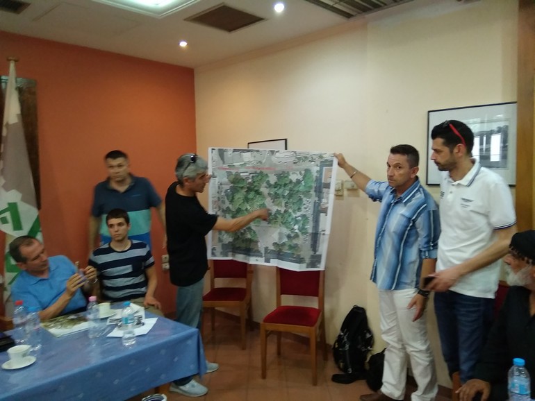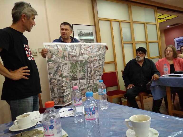-Η οργάνωση (χάρτες πλατείας) και το πανό της εξέδρας πίσω από τους ομιλητές.