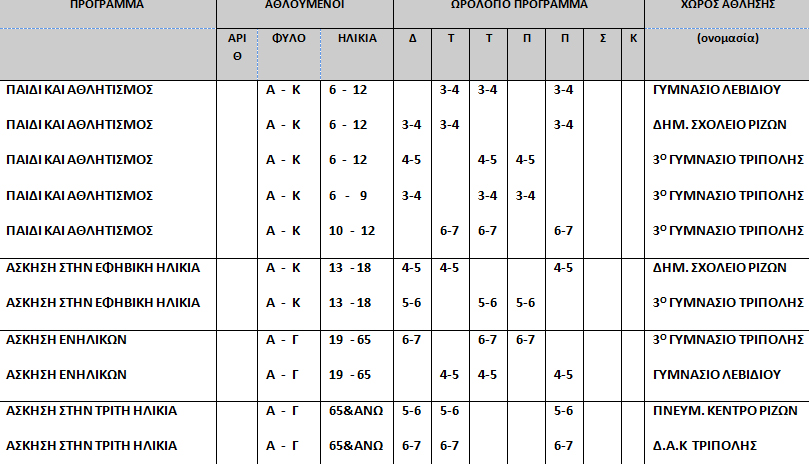 Το πρόγραμμα είναι δωρεάν, θα υλοποιείται στην Τρίπολη και στις δημοτικές ενότητες Λεβιδίου και Τεγέας από πτυχιούχους Φυσικής Αγωγής και περιλαμβάνει: