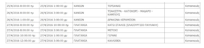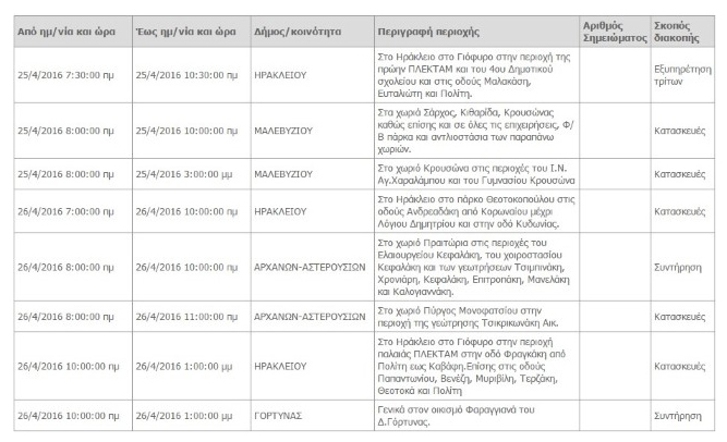 Σε προγραμματισμένες διακοπές ρεύματος προχωρεί η ΔΕΗ σήμερα, Μ. Δευτέρα 25 Απριλίου, και τη Μ. Τρίτη σε διάφορους δήμους των Νομών Ηρακλείου και Χανίων Κρήτης. Οι περισσότερες από τις διακοπές αυτές στην ηλεκτροδότηση αφορούν σε κατασκευαστικές εργασίες και σε εργασίες συντήρησης του δικτύου της ΔΕΗ.