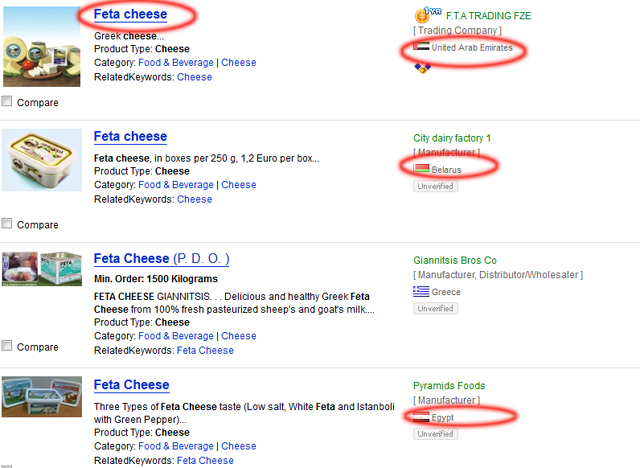 Για να διαπιστώσετε το μέγεθος της αδράνειας ή της παράνοιας του ελληνικού μηχανισμού μια απλή αναζήτηση στο alibaba (http://www.alibaba.com/showroom/feta-cheese.html) διαπιστώνετε ότι 312 εταιρείες σε όλο τον πλανήτη παράγουν και εμπορεύονται φέτα. Από την Ουκρανία και την Αίγυπτο μέχρι τις ΗΠΑ, την Αλβανία, την Τουρκία και άλλες χώρες. Αν τολμούσε κάποιος να κάνει κάτι αντίστοιχο με αμερικάνικο προϊόν ή γαλλικό ή ιταλικό θα ήταν τελείως διαφορετικό. Οι αντιδράσεις για την παγκόσμια ελληνική κατοχύρωση της φέτας ήταν τόσο μεγάλες που πήρε χρόνια η δικαστική διαμάχη με τη Δανία.