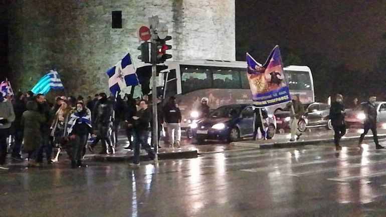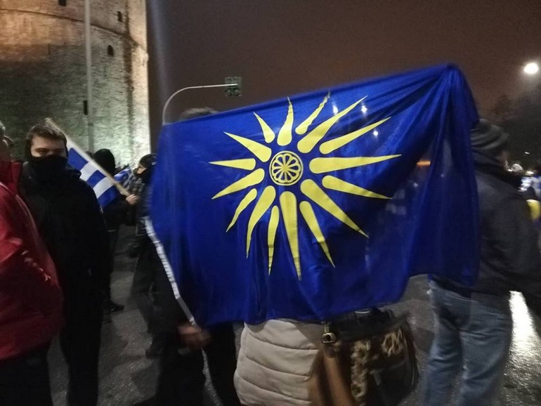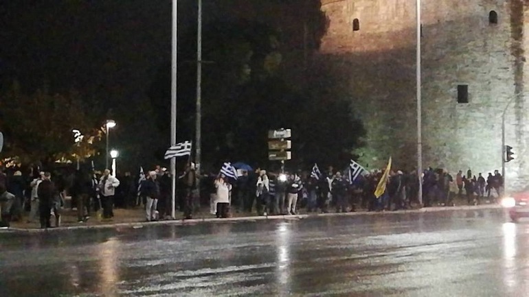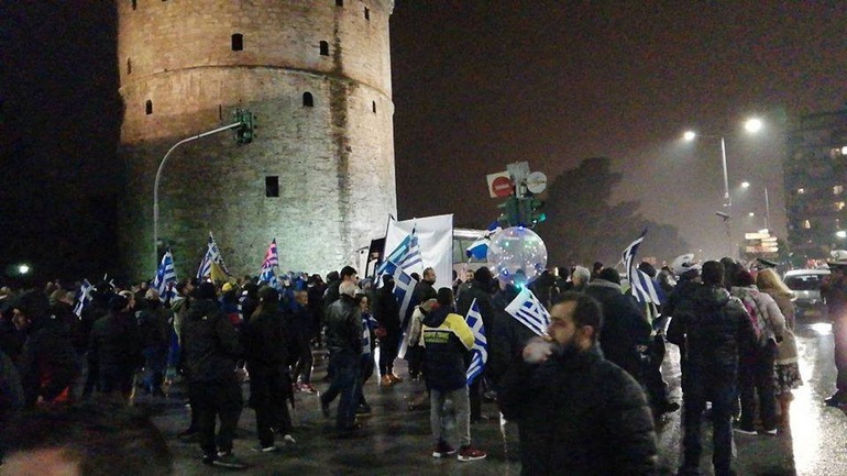 Ένταση επικράτησε περιμετρικά του Λευκού Πύργου όπου είχαν συγκεντρωθεί περισσότεροι από 400 πολίτες οι οποίοι διαδήλωσαν υπέρ της Μακεδονίας και προσπάθησαν να κατευθυνθούν προς το Παλέ ντε Σπορ.