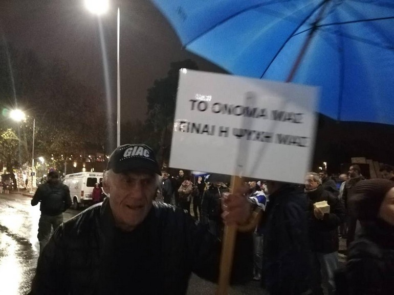 Ισχυρές αστυνομικές δυνάμεις βρίσκονταν στο σημείο και είχαν κλείσει τους γύρω δρόμους. Με εμβατήρια και κρατώντας λάβαρα πανό και ελληνικές σημαίες φωνάζουν υπέρ της ελληνικότητας της Μακεδονίας, κατηγορώντας τον Τσίπρα ως προδότη.