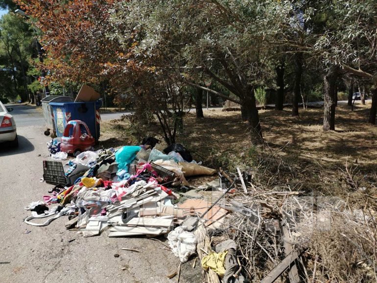 Δίπλα στους κάδους ένας λόφος από σκουπίδια. Πλαστικά, δύο σπασμένες και ευμεγέθεις τηλεοράσεις, άχρηστα παιδικά παιχνίδια, παλαιά λάστιχα αυτοκινήτου, κουρέλια, πολλά κουρέλια, γυάλινα δοχεία, πλαστικές σακούλες παντού, απροσδιορίστου χημικής ένωσης υγρά σε μπουκάλια. Μία χωματερή στην κεντρική λεωφόρο της κοινότητας, στην καρδιά του δήμου. Οι φωτογραφίες που τραβήχτηκαν την Κυριακή 30 Ιουνίου τα λένε όλα. Δεν χρειάζονται σχόλια.
