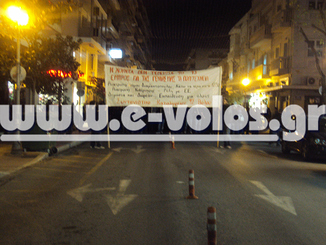 Σύμφωνα με το e-volos.gr, ομάδα διαδηλωτών, μετά το τέλος της πορείας που ξεκίνησε από τον Θόλο του Πανεπιστημίου Θεσσαλίας, προκάλεσαν μικροζημιές σε υποκαταστήματα τραπεζών και έστησαν οδοφράγματα.
